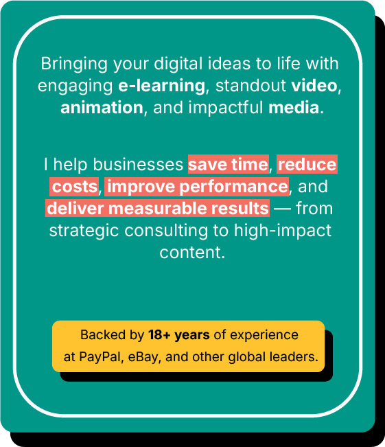 Need digital content that stands out?With nearly two decades of experience at global leaders like eBay and PayPal, I create e-learning solutions, explainer videos, custom animations, and standout visuals that don’t just look amazing — they deliver results.From concept to launch, I provide consulting, design, and development services tailored to your goals, ensuring your project meets the